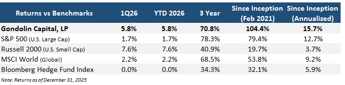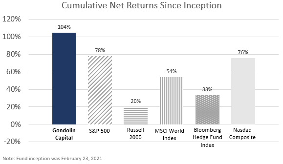 “Annualized Net Returns” refers to average annual investment returns net of all paid fees to the management company, Gondolin Management, LLC, including annual management fees, trading fees, and performance fees. Annualized Net Returns for Gondolin are provided by Gondolin’s servicing partner, Opus Fund Services. Index Returns for the S&P 500, Russell 2000, Bloomberg Hedge Fund Index, MSCI World Index, and NASDAQ are provided by Bloomberg.